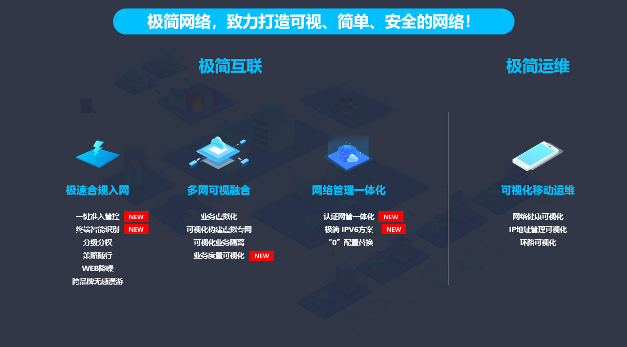 網(wǎng)絡(luò)管理一體化:認(rèn)證網(wǎng)管一體化;極簡(jiǎn) IPV6方案;“0”配置替換