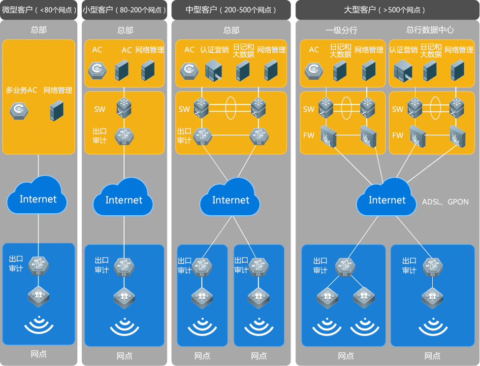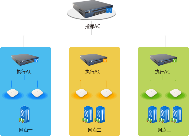 總行/分行部署AC,支行網(wǎng)點部署AP,統(tǒng)一組網(wǎng),集中管理;