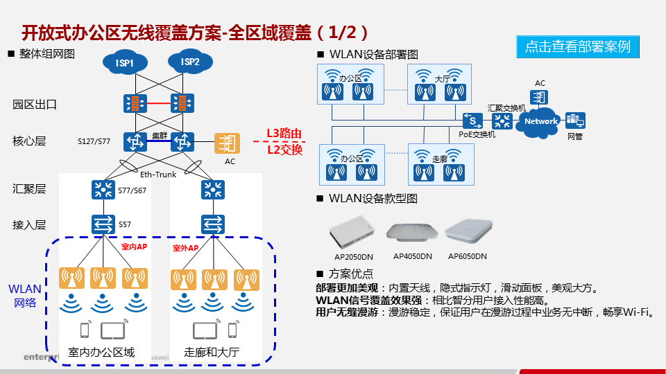 開(kāi)放式辦公室面積較大,且隔斷多,因此部署無(wú)線覆蓋分為室內(nèi)、室外。辦公區(qū)與會(huì)議室等較開(kāi)放區(qū)域使用吸頂式AP進(jìn)行無(wú)線覆蓋,獨(dú)立辦公室