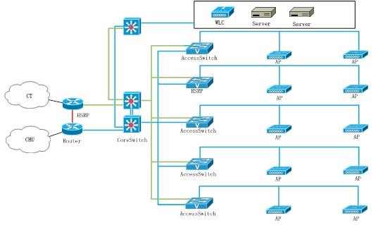 一到五樓面積一樣,每層樓布局幾乎一樣,人數(shù)較多,所以在第一樓到5樓部署AP2602 ,每層樓AP通過(guò)網(wǎng)線連接到樓層的訪問(wèn)層交換機(jī)上(AccessSwitch),訪問(wèn)層交換機(jī)是支持PoE供電,所有AP通過(guò)網(wǎng)絡(luò)供電。核心機(jī)房在三樓,在服務(wù)器區(qū)交換機(jī)上連接5508無(wú)線控制器,無(wú)線控制器采用端口聚合的方式與服務(wù)器交換機(jī)相連。