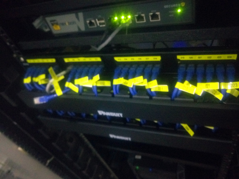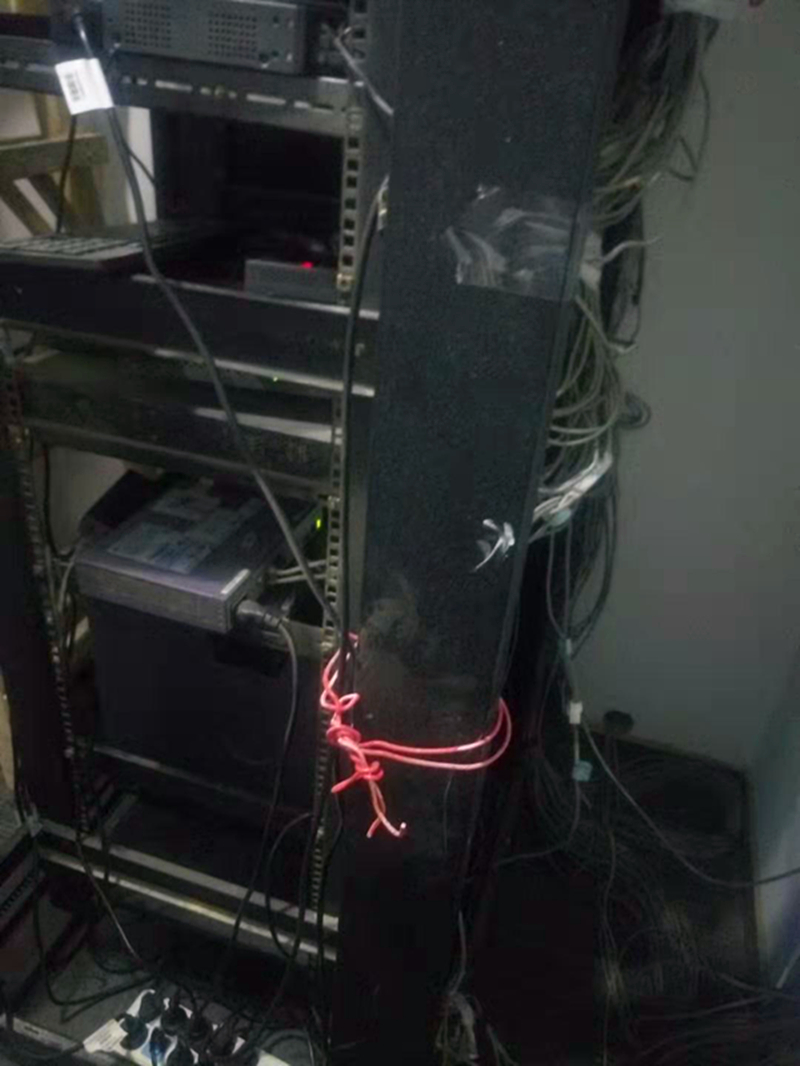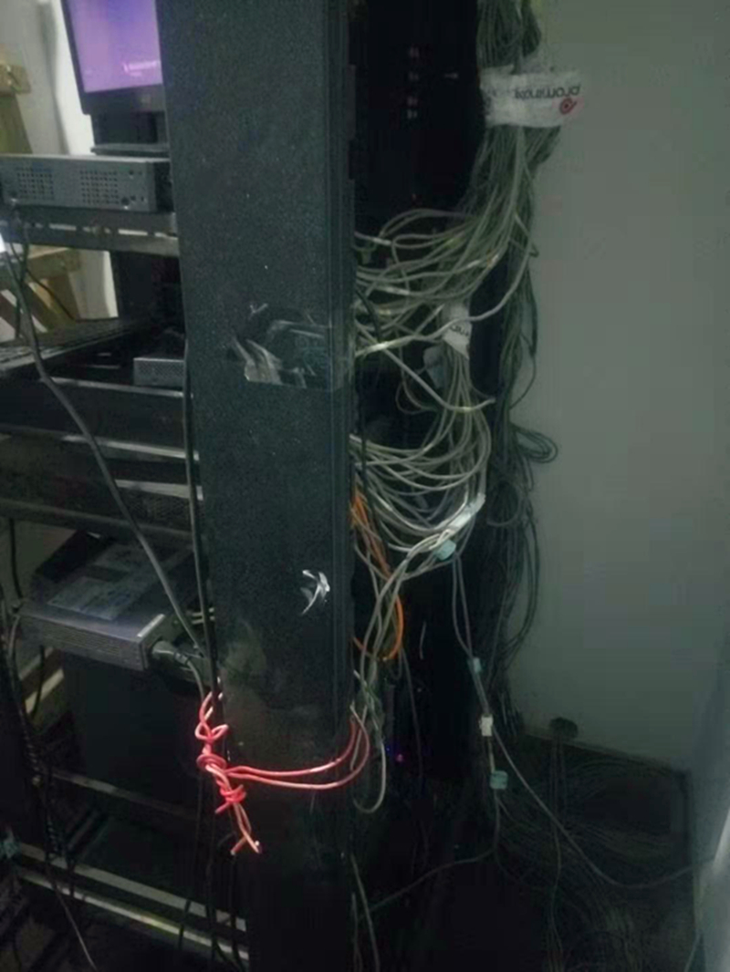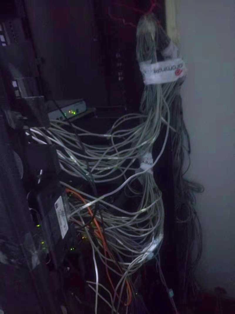 通過圖片可以看出那是相當(dāng)?shù)膩y啊,線亂堆、設(shè)備亂放、亂固定,能清楚的看到,很多線都是隨便一束然后用膠帶固定起來,甚至機架都有很多地方用的膠帶纏上的。都9102年了,大家能想象還有這樣的機房嗎?亂和無序就是對這個機房最適宜的評價了。