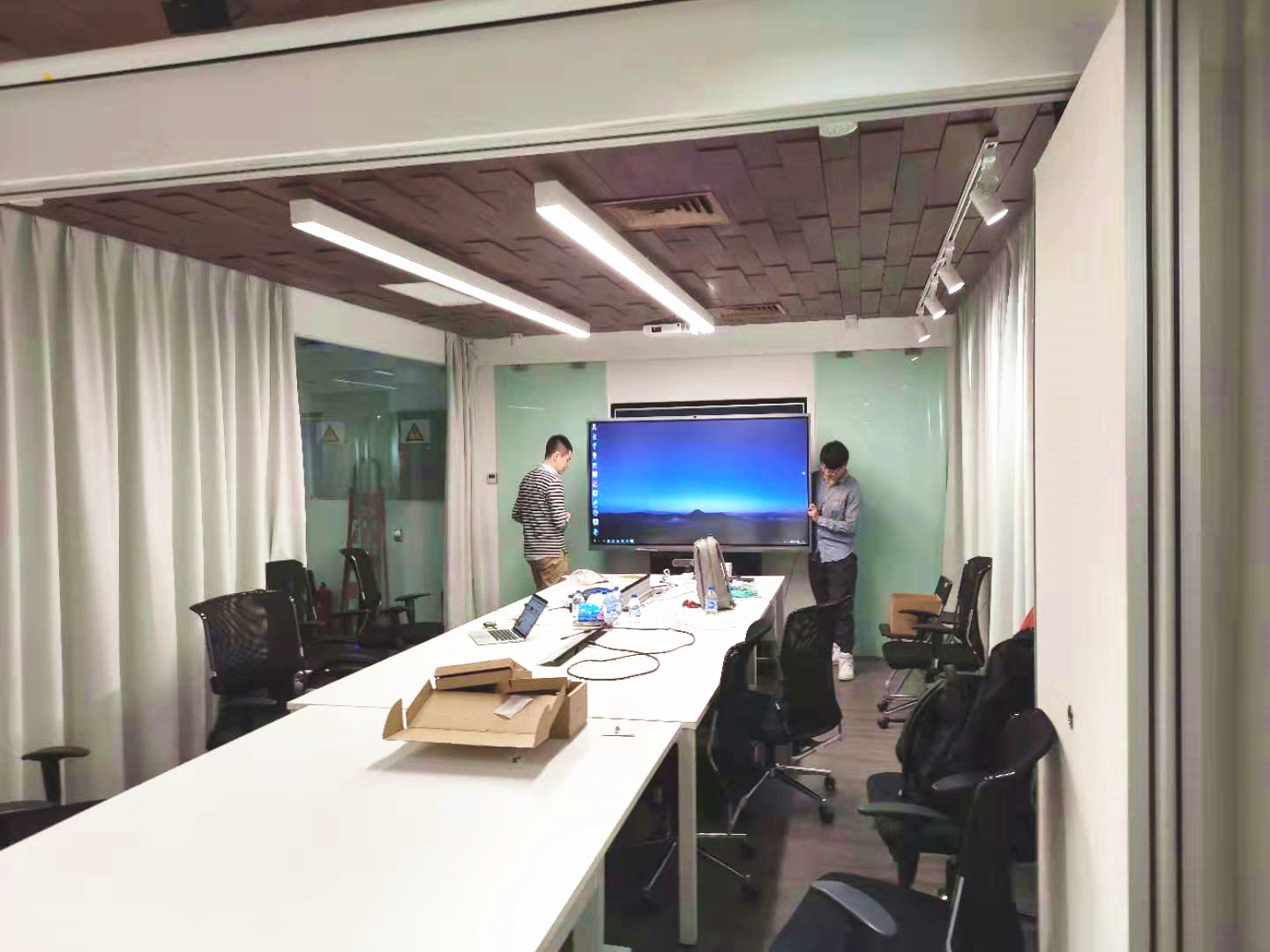 這是一個(gè)20*4m的長(zhǎng)條形中型會(huì)議室,既負(fù)責(zé)外聯(lián)會(huì)議也負(fù)責(zé)內(nèi)部頭腦風(fēng)暴,原有的視頻會(huì)議設(shè)備面對(duì)現(xiàn)有需求力不從心,顯示畫面質(zhì)量和便捷的交互展示性能是此次改造的關(guān)鍵。炫億時(shí)代企業(yè)通信服務(wù)團(tuán)隊(duì)在做方案設(shè)計(jì)時(shí)選擇了MAXHUB 75 寸的4K智能會(huì)議平板和羅技CC4000e 4K超高清會(huì)議攝像頭,搭建了一個(gè)中小型會(huì)議室智能視頻會(huì)議系統(tǒng)。