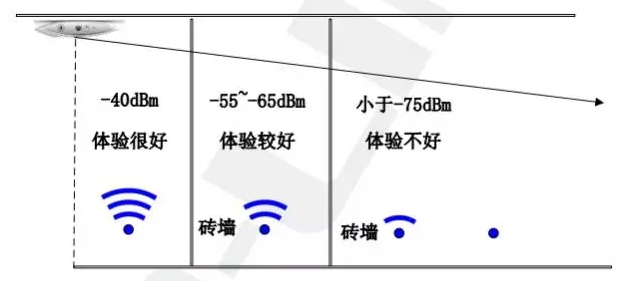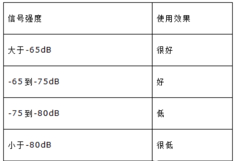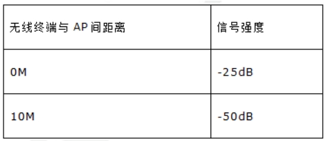 工程實(shí)施完畢后,客戶可使用手機(jī)APP 軟件“WiFi 分析儀”或筆記本無線信號(hào)測(cè)試軟件等常用測(cè)試軟件測(cè)試覆蓋范圍內(nèi)各點(diǎn)位信號(hào)強(qiáng)度,附表為參考數(shù)值: