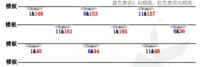 在頻段帶寬為20MHz 的條件下,在2.4G 頻段,1、6、11 信道理論相互不會(huì)干擾;5G頻段36、40、44、48、149、153、157、161、165 信道理論相互不干擾。工程完成后,配置過程需要根據(jù)AP 的安裝位置,手動(dòng)指定各個(gè)AP 的無線信道。