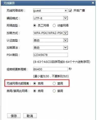 在無線網(wǎng)絡(luò)中,如果廣播包過多,會(huì)對(duì)無線網(wǎng)絡(luò)質(zhì)量造成比較大的影響。所以如果沒有特殊需求的情況下,建議將AP 下面的無線客戶端進(jìn)行隔離,如圖