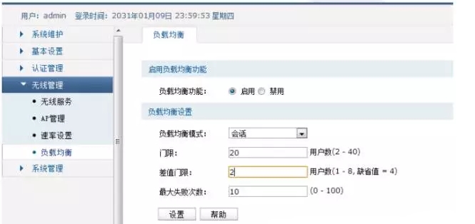 基于接入用戶數(shù)的負(fù)載均衡,當(dāng)AP 間的用戶數(shù)量超過設(shè)定的閾值時(shí),AC(僅AC1000支持) 能夠動(dòng)態(tài)調(diào)整用戶在不同AP 間的均勻分布,防止個(gè)別AP 過載。