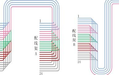 依據(jù)圖示,在A配線架上雙絞線的擺放為1號線最早呈現(xiàn),其他線按次序出線,擺放規(guī)整;在B配線架上為24號線先出線,改為了下出線方法,因為最上層的線悉數(shù)掩蓋在所有的線上,堅持了一層徹底平坦的斜線,所以在B配線架上照舊漂亮。