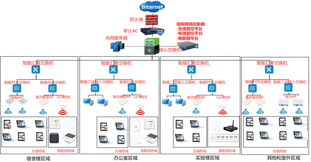 1、根據(jù)校園景采用不同方案統(tǒng)一組網(wǎng),實(shí)現(xiàn)室內(nèi)、室外無盲區(qū)覆蓋,信號(hào)穩(wěn)定、速度快。依據(jù)接入人群創(chuàng)建不同的無線網(wǎng)絡(luò),辦公網(wǎng)、教學(xué)網(wǎng)、學(xué)生網(wǎng)相互隔離,互不影響;