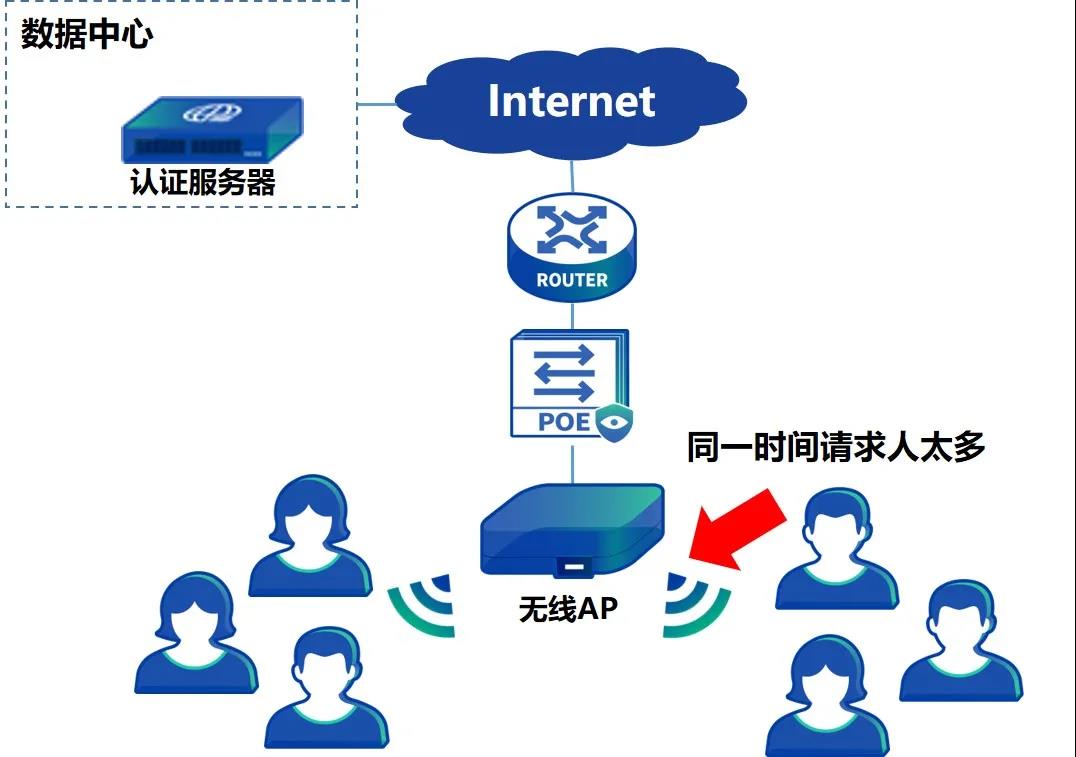 機(jī)場(chǎng)、酒店大廳等公共區(qū)域同時(shí)間上網(wǎng)的人太多,大量用戶同時(shí)申請(qǐng)認(rèn)證,瞬間流量太大,設(shè)備難以承載。