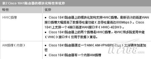 Cisco1841路由器提供了增強(qiáng)模塊化功能,同時(shí)可保護(hù)客戶投資。此模塊化架構(gòu)的設(shè)計(jì)可提供支持并發(fā)安全應(yīng)用所需的更高帶寬和性能。Cisco1841支持大部分現(xiàn)有WIC、多路復(fù)用中繼接口卡(僅用于數(shù)據(jù))和高級集成模塊(AIM)。表2列出了Cisco1841路由器的模塊化特性優(yōu)勢。