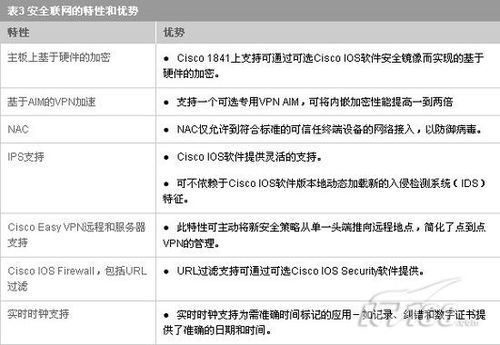 Cisco1800系列在主板上提供了可由可選CiscoIOS軟件安全鏡像支持的內(nèi)置硬件加速加密。板載硬件加速加密卸載了加密過程,提供了更高的IPSec3DES和AES吞吐量。憑借可選VPNAIM、用于病毒防御的NAC和基于CiscoIOS軟件的防火墻和IPS支持的集成,思科提供了適用于中小型企業(yè)和大型企業(yè)分支機(jī)構(gòu)的、業(yè)界領(lǐng)先的強(qiáng)大、可適應(yīng)安全解決方案。表3列出了路由器中集成的安全特性和優(yōu)勢。