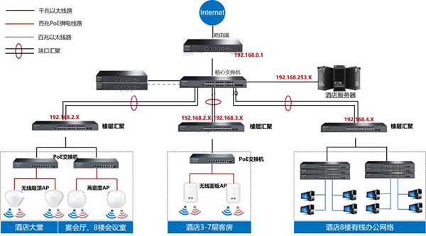 網(wǎng)絡(luò)拓?fù)鋱D最能直觀的展示一個(gè)網(wǎng)絡(luò)結(jié)構(gòu),它能展示網(wǎng)絡(luò)的核心設(shè)備、線路連接結(jié)構(gòu)、子網(wǎng)劃分等信息。例如為某酒店設(shè)計(jì)的網(wǎng)絡(luò)拓?fù)鋱D