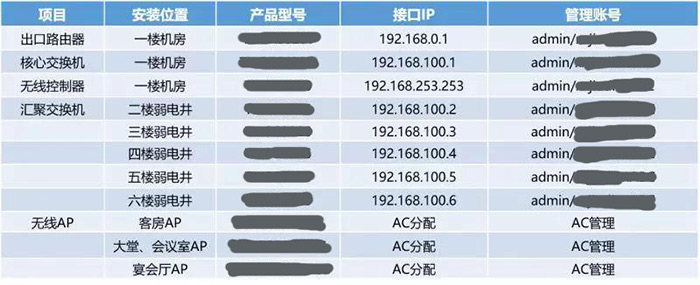制作設(shè)備信息表格,是指對(duì)網(wǎng)絡(luò)中設(shè)備的型號(hào)、管理IP地址、管理賬號(hào)、安裝位置等進(jìn)行記錄,方便在維護(hù)時(shí)快速了解設(shè)備的管理信息。